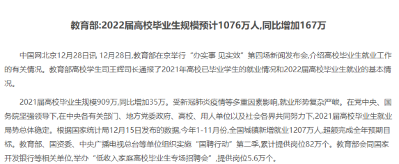 教育部公布的數(shù)據(jù)顯示,2022屆高校畢業(yè)生總規(guī)模預(yù)計突破1000萬人,高校畢業(yè)生人數(shù)將達(dá)到1076萬人,同比增加167萬人,再創(chuàng)歷史新高。另外因疫情影響,最近兩年的海歸留學(xué)生越來越多,導(dǎo)致高校畢業(yè)生又多了一批實力強(qiáng)勁的競爭對手,高校畢業(yè)生的就業(yè)壓力或?qū)⒆兊酶,就業(yè)形勢復(fù)雜嚴(yán)峻。