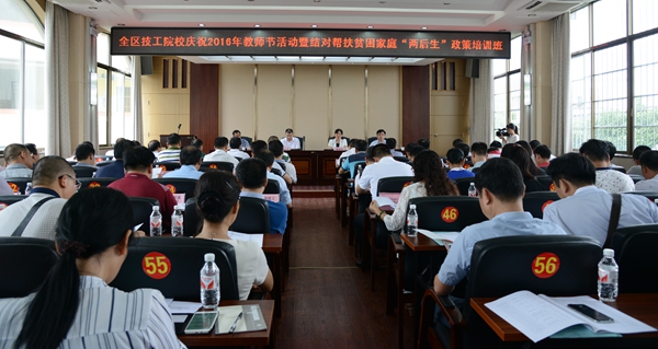 9月8日,廣西技工院校2016年教師節(jié)慰問活動(dòng)暨結(jié)對(duì)幫扶貧困家庭“兩后生”政策培訓(xùn)班在廣西交通技師學(xué)院舉行。自治區(qū)人社廳副廳長(zhǎng)潘志金、職業(yè)能力建設(shè)處處長(zhǎng)楊春華等領(lǐng)導(dǎo)出席。來自全區(qū)46所技工院校120多名代表參加了會(huì)議。