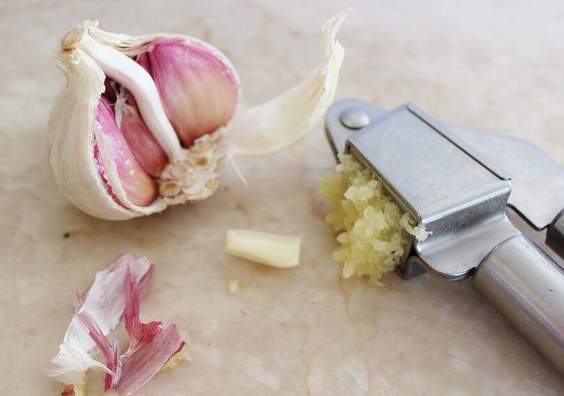 蒜能夠提味。烹調(diào)雞、鴨、鵝肉的時(shí)候宜多放蒜,這樣使肉更香更好吃,也不會(huì)因?yàn)橄涣级鵀a肚子。