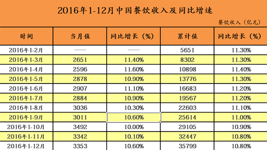 數(shù)據(jù)顯示,2016年中國餐飲收入單月增長速度同樣維持在10%以上,穩(wěn)步增長。