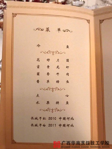 國宴作為國內(nèi)最牛的飯局,一絲一毫都受到了各方關(guān)注。此次“一帶一路”國際合作高峰論壇歡迎晚宴,除了冷盤、點(diǎn)心、水果之外,菜單上主要含有四道熱菜,分別是富貴龍蝦、菌香牛肉、香草鱈魚和花好月圓(根據(jù)英文的翻譯應(yīng)該是鴿子蛋和扇貝湯)。