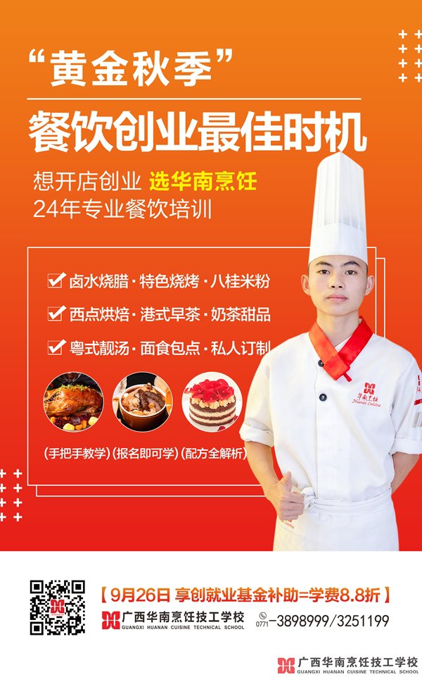 廣西華南烹飪技工學(xué)校為滿足更多人實現(xiàn)烹飪創(chuàng)業(yè)夢,特開設(shè)了適合不同人群不同專業(yè)的特色短期創(chuàng)業(yè)班,為創(chuàng)業(yè)者提供多種多樣的選擇,你可以零基礎(chǔ)來學(xué)習(xí),少走些彎路,少一些煩惱,廣西華南烹飪技工學(xué)校幫你開啟烹飪界創(chuàng)業(yè)大門。