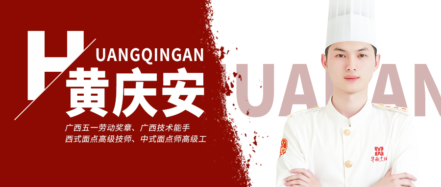 名師專訪-黃慶安 職稱:廣西五一勞動獎章、廣西技術能手、 西式面點高級技師、中式面點師高級工 擅長:產(chǎn)品研發(fā)、技術培訓、賽事培訓 / 個人榮譽 / 南麥面包創(chuàng)意杯競賽金獎; 全國西點院校技術交流大賽烘焙金獎; 長