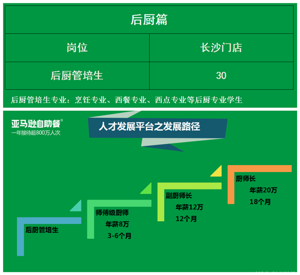 1、入職前半年,按照批次每3個(gè)月結(jié)合門店績效,組織一次晉級,優(yōu)秀的后廚管培生直接晉升為上一層級崗位,工資漲幅在500以上。