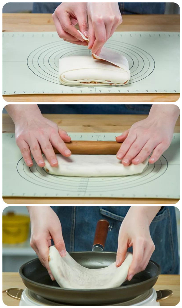 10、再用搟面杖把面餅輕輕搟開,盡量的搟薄一些,方便煎熟。