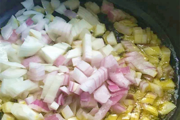 7. 鍋中入油燒熱倒入洋蔥炒香。
