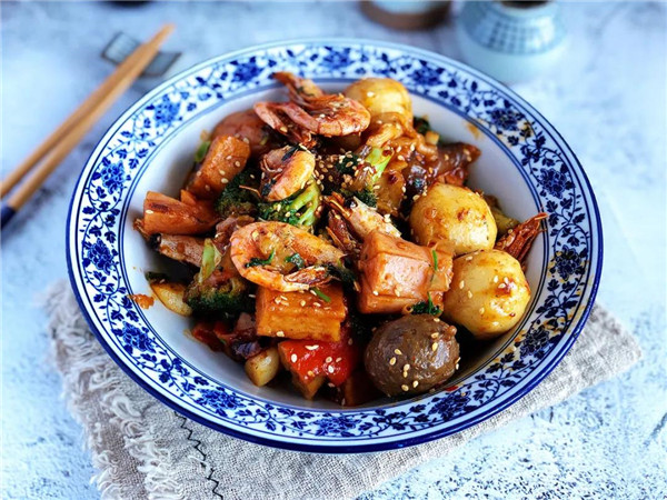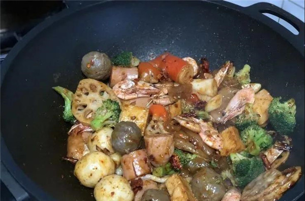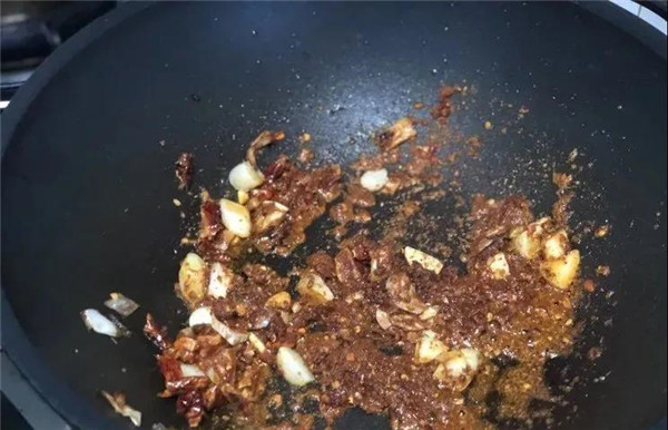6. 取適量麻辣香鍋調(diào)料倒入鍋中炒香,紅紅的顏色非常漂亮。