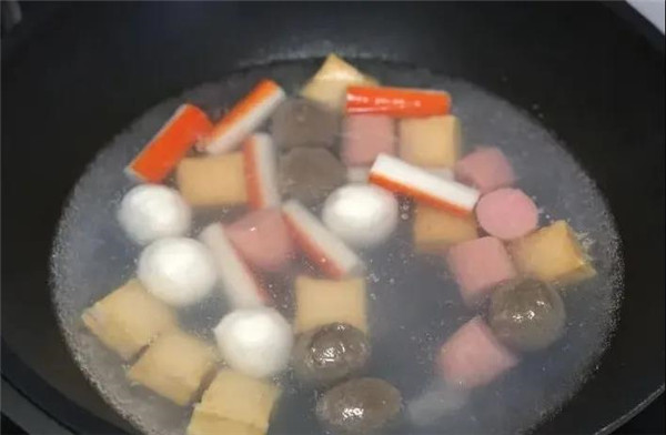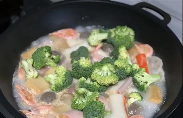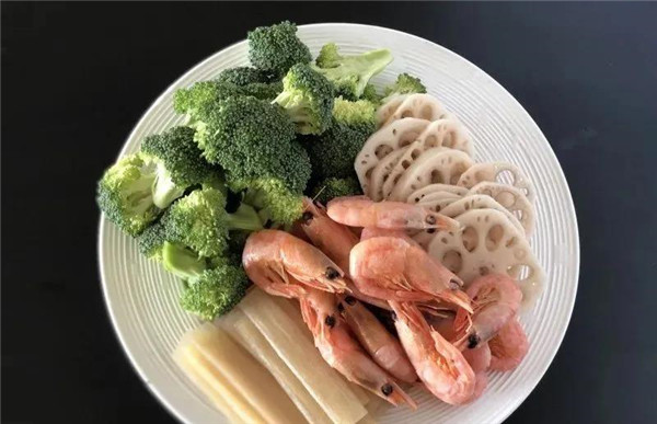 1、首先來準備一下食材,北極甜蝦,西蘭花,藕片以及各種魚丸,全部處理干凈,切的大小適中(所有食材均可以根據(jù)自己的喜好替換)。