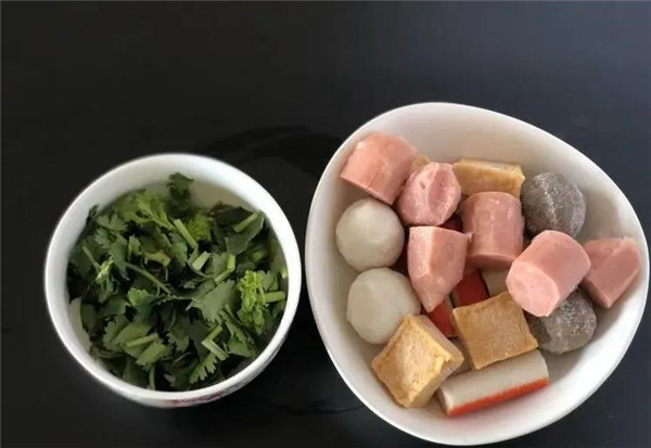 2. 魚丸類的要提前一會兒拿出來解凍,香菜是麻辣香鍋的靈魂,必不可少,洗凈切成1厘米長的小段備用。