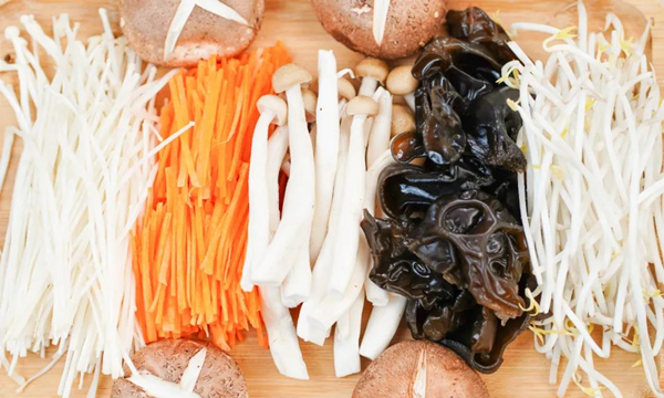 1. 將豆芽、胡蘿卜和各類菌菇洗凈,香菇改花刀,胡蘿卜切絲,起鍋燒油,先下入豆芽炒至斷生;