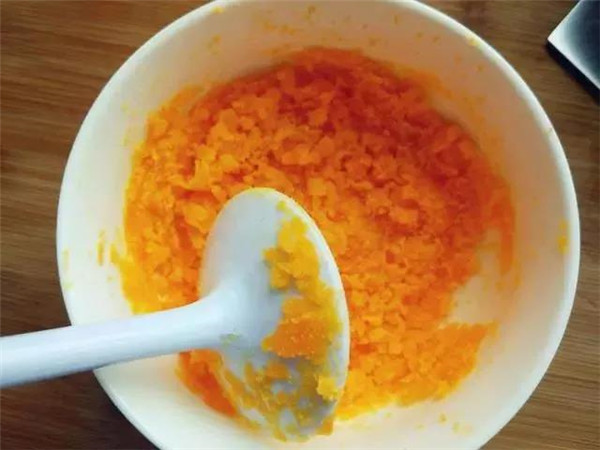 熱鍋熱油,爆香蔥花,將咸蛋黃倒入稍炒一下。如果蛋黃太干,可再加少許油,不要加水。