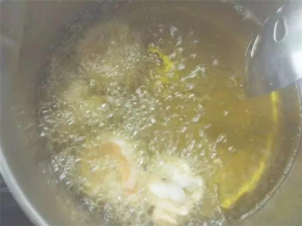 油溫五六成熱,約150°左右,將蝦仁倒入炸到八成熟。