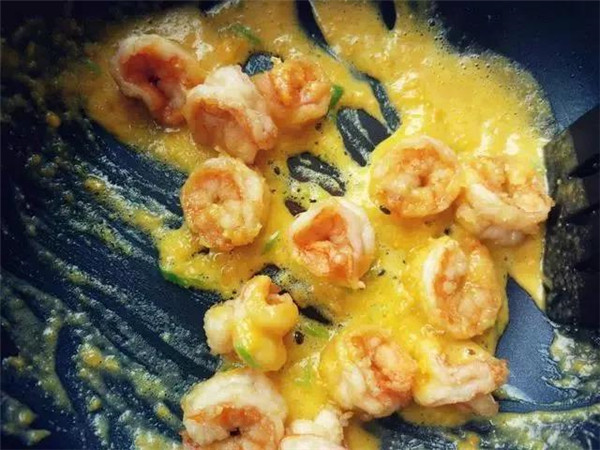 倒入蝦仁,迅速翻炒到裹滿蛋黃,盛出即可。
