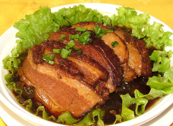 (4)取出瀝汁,倒扣在一個(gè)大盤(pán)子上。鍋再炒瀝出的汁勾個(gè)芡,澆面扣肉上即成。