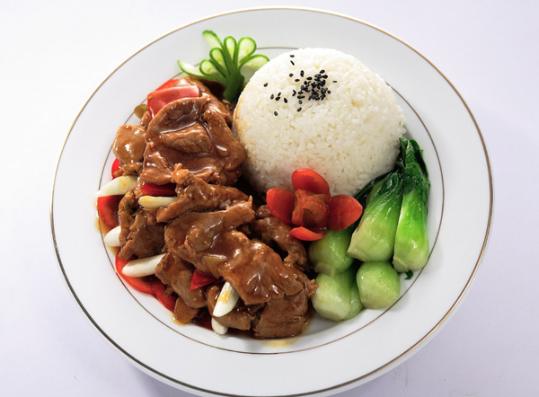 (2)鍋加油燒熱熱,下蔥段炒香,再加入羊肉片翻幾下,加調(diào)味汁,火要大,手不要停。這菜很重火候。