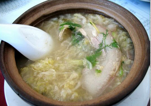 2.砂鍋白肉比白煮肉有滋味得多,最重要的就是因?yàn)榧尤肓怂岵,不但改善了口味,更改善了口感,因(yàn)樗岵说乃嵛逗芎玫刂泻土宋寤ㄈ獾挠湍伕小?/p>