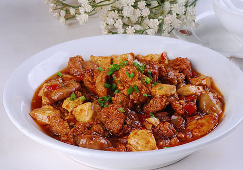 肉片倒在之前燙過的豆花上即可,如果喜歡味道重一些的話,可以在撒上適量的辣椒面、花椒面、香蔥。