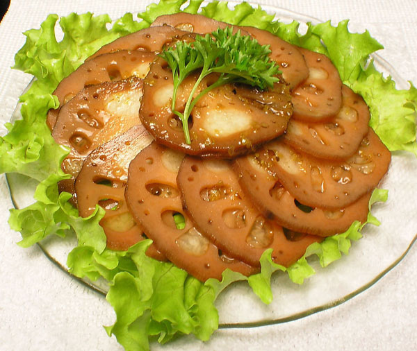 (4)出鍋晾涼備用。鍋放油,將蒸出的汁倒入,放冰糖、青紅絲茉,水過少加些,勾芡淋上桂花。澆在切好的藕片上即成。