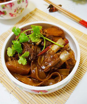 羊排燉好了之后,剩約1/3水,放入寬粉和蘿卜,放入鹽和少量白糖調(diào)味(羊排比較多,一頓吃不完,因此盛出了一部分)
