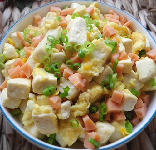 12.等豆腐快出鍋時(shí),可加入少量火腿丁翻炒,中和味道,關(guān)火出鍋盛盤,撒少許香蔥(調(diào)節(jié)顏色,看起來更加有食欲)。