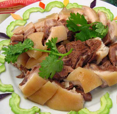 1、將狗肉切片碼味后裝盤上籠蒸3分鐘;