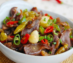 4、油燒得非常熱的時候把鴨肫倒入翻炒;