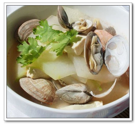 材料:鮮蝦、海虹、花蛤、冬瓜、蔥姜、香菜、鹽、雞精、香油。