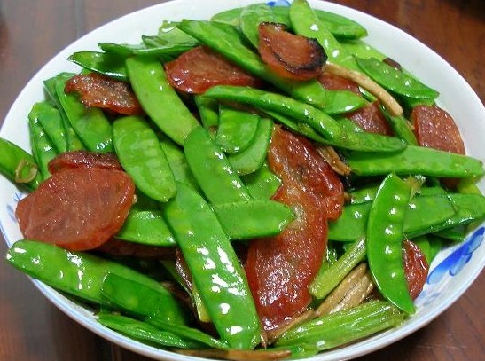 臘肉中磷、鉀、鈉的含量豐富,還含有脂肪、蛋白質(zhì)、碳水化合物等元素,具有開胃祛寒、消食等功效。荷蘭豆性平、味甘,具有和中下氣、利小便等功效,能益脾和胃、生津止渴、除呃逆、止瀉痢。常食用對脾胃虛弱、小腹脹滿、嘔吐瀉痢、煩熱口渴均有療效。
