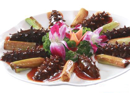 4、把炒勺放旺火上,倒入大油燒熱,放入蔥段炸成黃色撈出加入清湯、料酒、白糖、糖色、醬油、味精和毛姜水,燒開后撇去浮沫。而后將煨好的海參、炸好的蔥段放入,湯再次燒開后,隨即淋入濕淀粉勾芡。出勺加蔥油,擺盤即成。