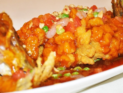 6、炒鍋內(nèi)下油放旺火上,加黃酒、姜汁、精鹽、雞湯100毫升、味精,燒沸用濕淀粉調(diào)稀勾芡,下胡椒粉、蔥白末椎勻起鍋澆在魚的全身即成。