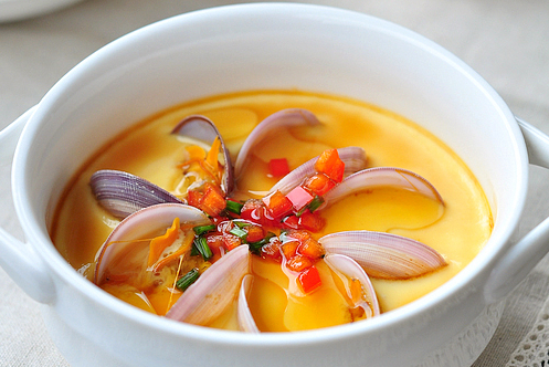 6、把蛤蜊插到蒸好的水蛋上再稍微蒸一分鐘就好。