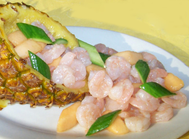 鮮蝦、菠蘿、青椒、番茄醬、淀粉、白糖、料酒、胡椒粉、鹽、油