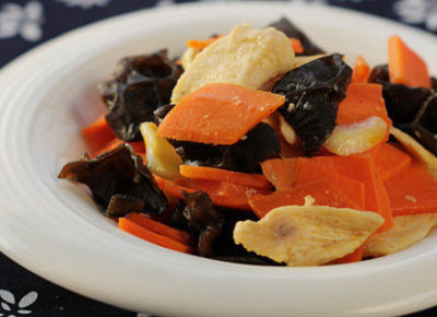 胡蘿卜、木耳、雞胸肉、雞蛋清、淀粉、蒜、料酒、胡椒粉、油、鹽