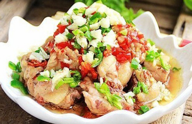7、將切好的蒜末和辣椒末撒在蒸好的雞塊上;