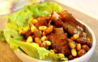 5、上色后加入淹沒(méi)排骨的水,加五香粉、八角、鹽、黃豆花生。