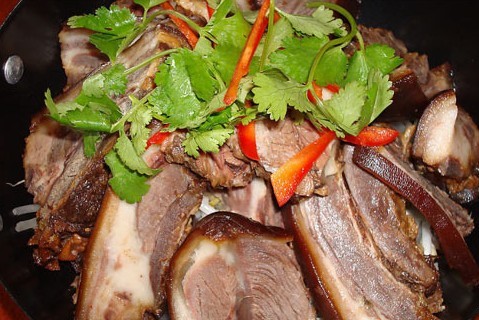 2、放入大鍋,將全部調(diào)料一起下鍋,加水至浸沒(méi),旺火燒滾后,再用中火,煮至酥爛出鍋,冷卻后拆骨;