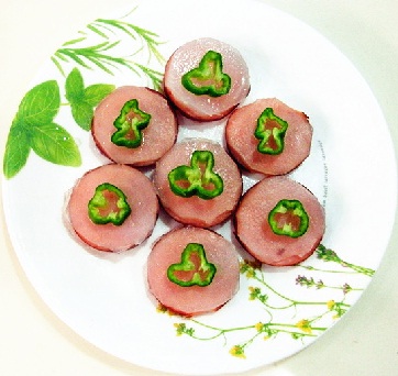 4、將涼皮培根派裝盤后,用青椒圈點(diǎn)綴,置于微波爐高火2分鐘,取出后,淋入豉油即可食用。