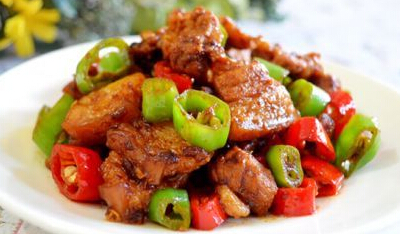 材料:五花肉、紅椒、黃椒、綠椒(各半個(gè))