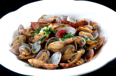 2、熱鍋少油,放去了籽的干紅辣椒,蒜片煸香,倒入瀝過(guò)水的蛤蜊,加入清酒,蓋上鍋蓋。