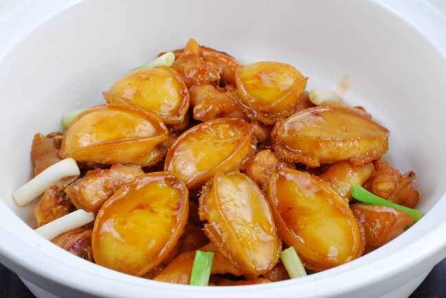 5、雞塊炒到全部收縮時,下料酒,燜鮑魚的湯汁,再加些許水,用鮑魚汁調好味,蓋上鍋蓋將雞塊燜至八成熟。