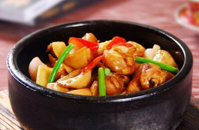 5、在鍋中調(diào)入米酒和清雞湯,大火燒沸后加蓋,轉(zhuǎn)小火慢慢燜煮40分鐘,其間揭開蓋攪拌一次,待湯汁即將收干時將九層塔葉放入鍋中翻炒數(shù)下即可。