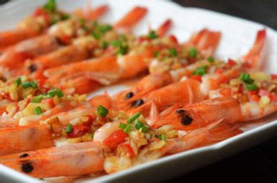 5、將剛才炒好的蒜末用小勺放在蝦背上。