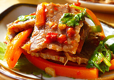 材料:牛肉(適量)、胡蘿卜(適量)、香菜(適量)、辣椒醬(適量)、料酒(適量)、麻油(適量)