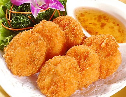 3、將蝦泥用手攥成4cm直徑大小的蝦球,裹上面包糠,用手掌將沾滿(mǎn)面包糠的蝦球壓成餅狀。