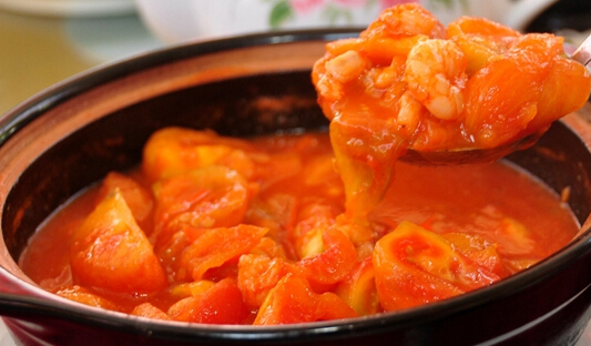 食材:番茄2個、蝦仁12、鹽、蛋清、生粉、料酒、姜蔥蒜適量