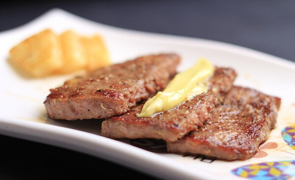 2、菜刀放平,將牛里脊肉拍薄。將芥末沙司放入法蘭盤煮沸,放入牛排,燒上3分鐘,不要把牛排燒老,然后裝盤,盤邊配些炸土豆條或者花菜、綠蘆筍等蔬菜,即可上桌。
