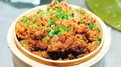 5、腌好的牛肉逐一粘上蒸肉米粉,上籠蒸上,大火燒開轉小火蒸二個小時。