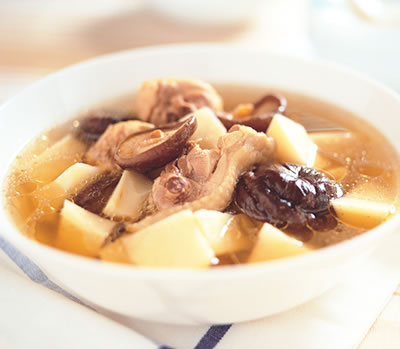 4、文火煲40分鐘,湯變成溫和的白色,水位下降一寸后,下入香菇、竹筍繼續(xù)煮20分鐘即可。