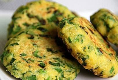 材料:豆渣50克、玉米面適量、韭菜50克、雞蛋1個(gè)。