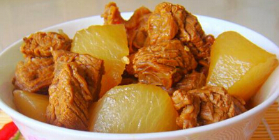 6、將切好的牛腩與蘿卜一起入鍋燒開,文火燉半小時(shí);